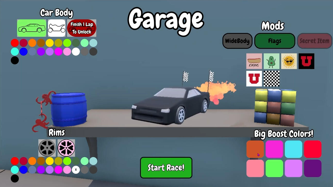 UE Bleuprints: Drifting car with speed boosts, Lap time tracker, Garage with customizable car, Waving flags speed scale based on speed