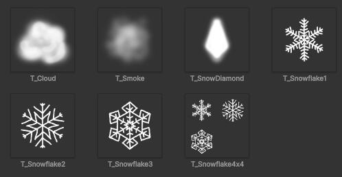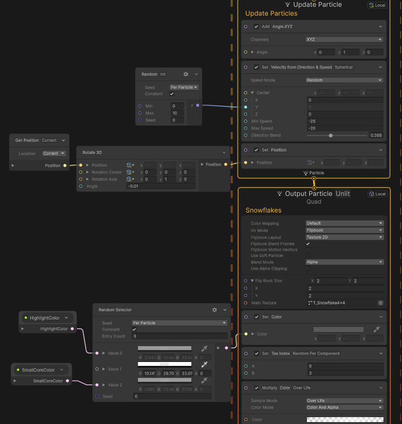 Snowflakes: Used texture sheet to spawn different types of snowflakes with random color for uniqueness. Velocity from Direction and Speed (Spherical) with a random integer to pull the snowflakes to a random point within the entire height of the tornado. (Image Left)